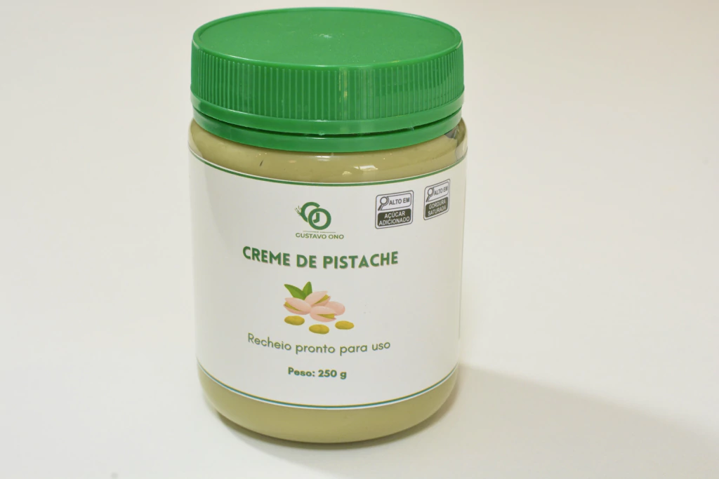 Ingredientes: óleo de girassol, açúcar, pasta de pistache e corante (INS 141)), leite em pó desnatado, leite em pó integral e emulsificante lecitina de girassol (INS 322).